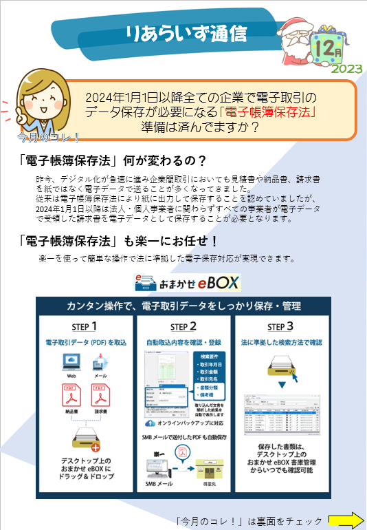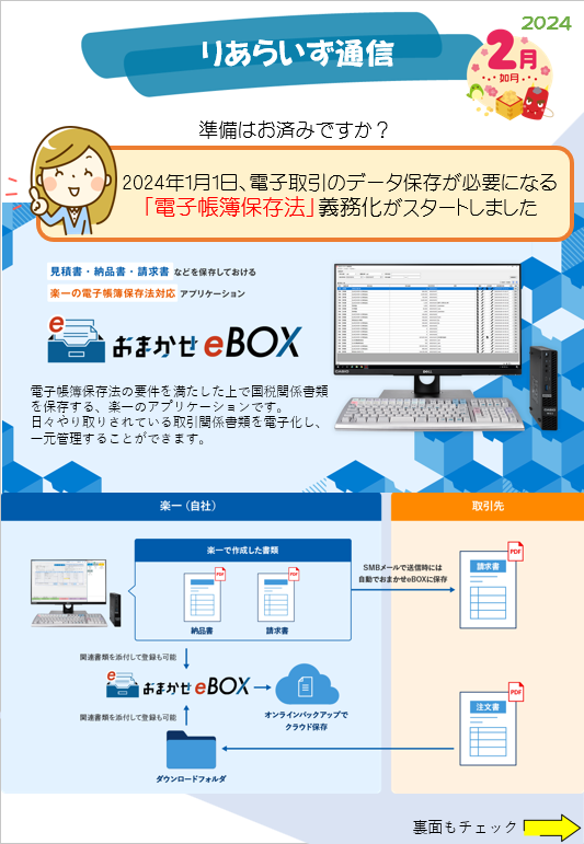 全ての企業で電子取引のデータ保存が必要とされる「電子帳簿保存法」の説明と楽一で簡単にデータを保存できる「おまかせeBOX」をご紹介します